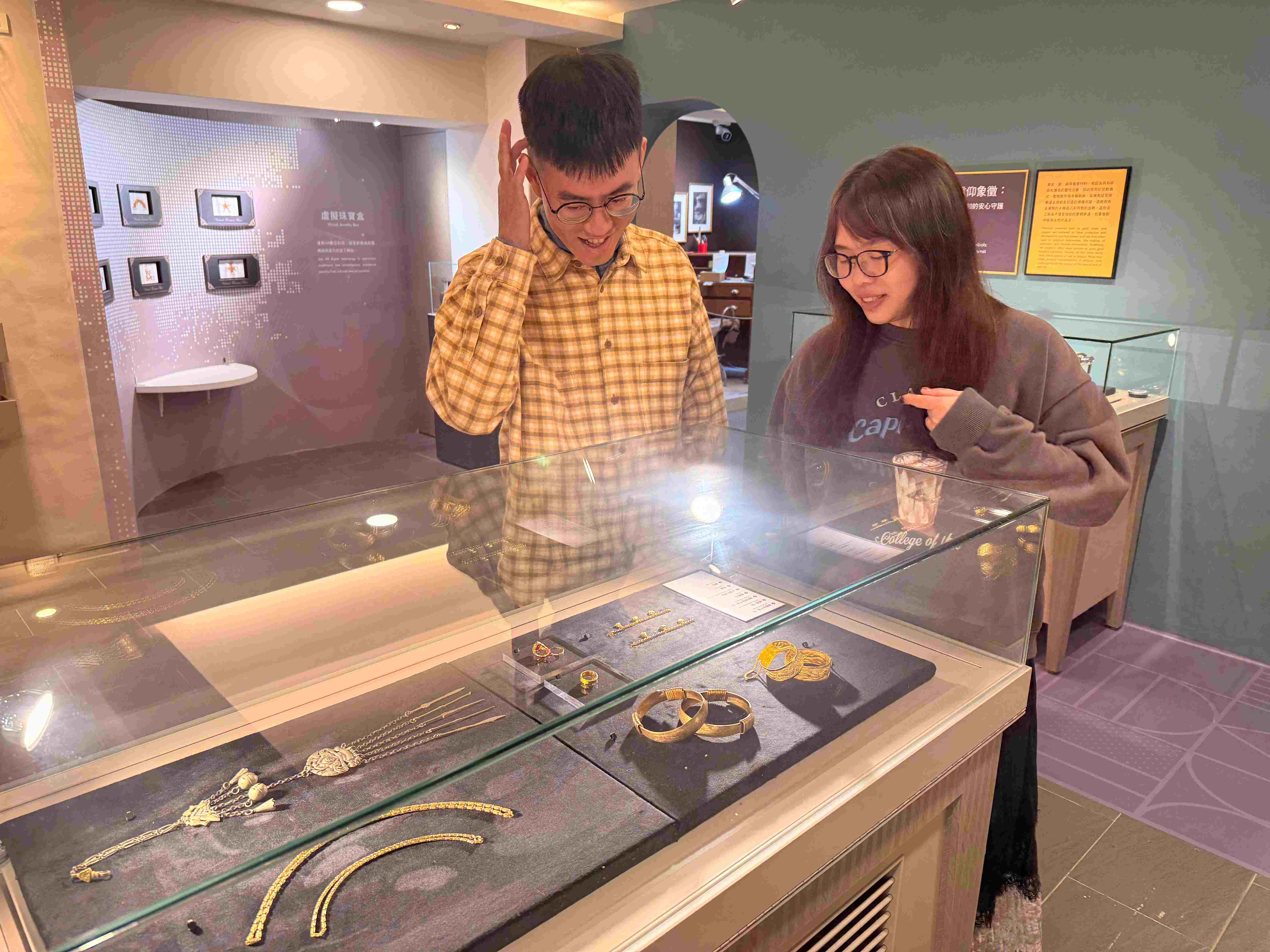 金屬工藝館「金工流轉:傳統與當代的交會」常設展,以博物館典藏的42件傳統金飾與15件當代金工作品為媒介,演繹金屬工藝的形式流變。黃金曾是金瓜石引以為傲的礦產,本展特別以文化創意活化礦業記憶,展區分為「珍藏老金飾」與「當代金工」兩大主題。前者透過「新生喜悅」、「富貴長壽」等子題,揭示傳統金飾在生命禮俗及常民日常中的深刻意涵;後者則展示融合鍛造、鑄造等技術與多元材質的現代創作,突破飾品功能限制,展現藝術的無限可能。現場更結合AR擴增實境遊戲,讓民眾透過手機體驗虛擬尋寶。
